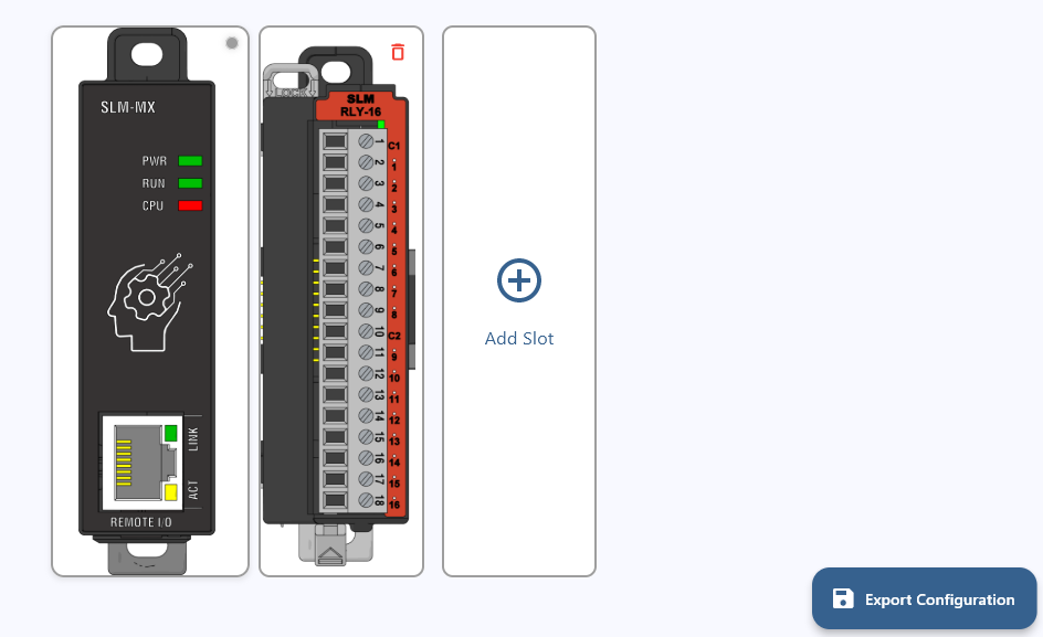 Once you’ve added and configured all the modules you need, you can save the configuration by selecting the “Export Configuration” button on the bottom right of the page. This will export as a .slmmx file.