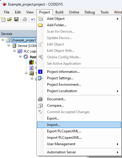 Next, on the device tree on the left, click on the project name at the top of the tree to highlight it, and select Project -> Import Project.