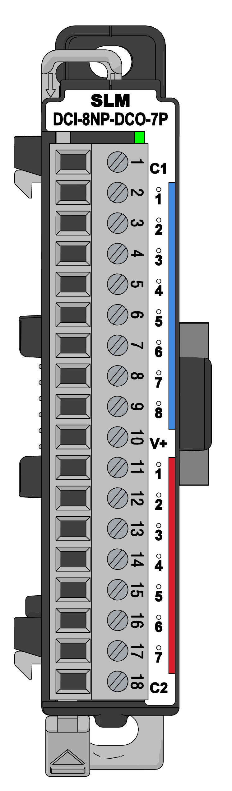 8-channel 24VDC sink/source inputs and 7-channel 24VDC sourcing outputs.